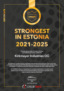 The Strongest in Estonia title enables companies like ours to stand apart from competitors with a concrete demonstration of trustworthiness and creditworthiness. Because only a few Estonian companies achieve this high credit score, the certificate applauds and recognises the companies and their employees. In other words, this certificate shows that Kirkmayer Industries OÜ is a company with stable, exemplary financial and economic behaviour as a trustworthy partner.